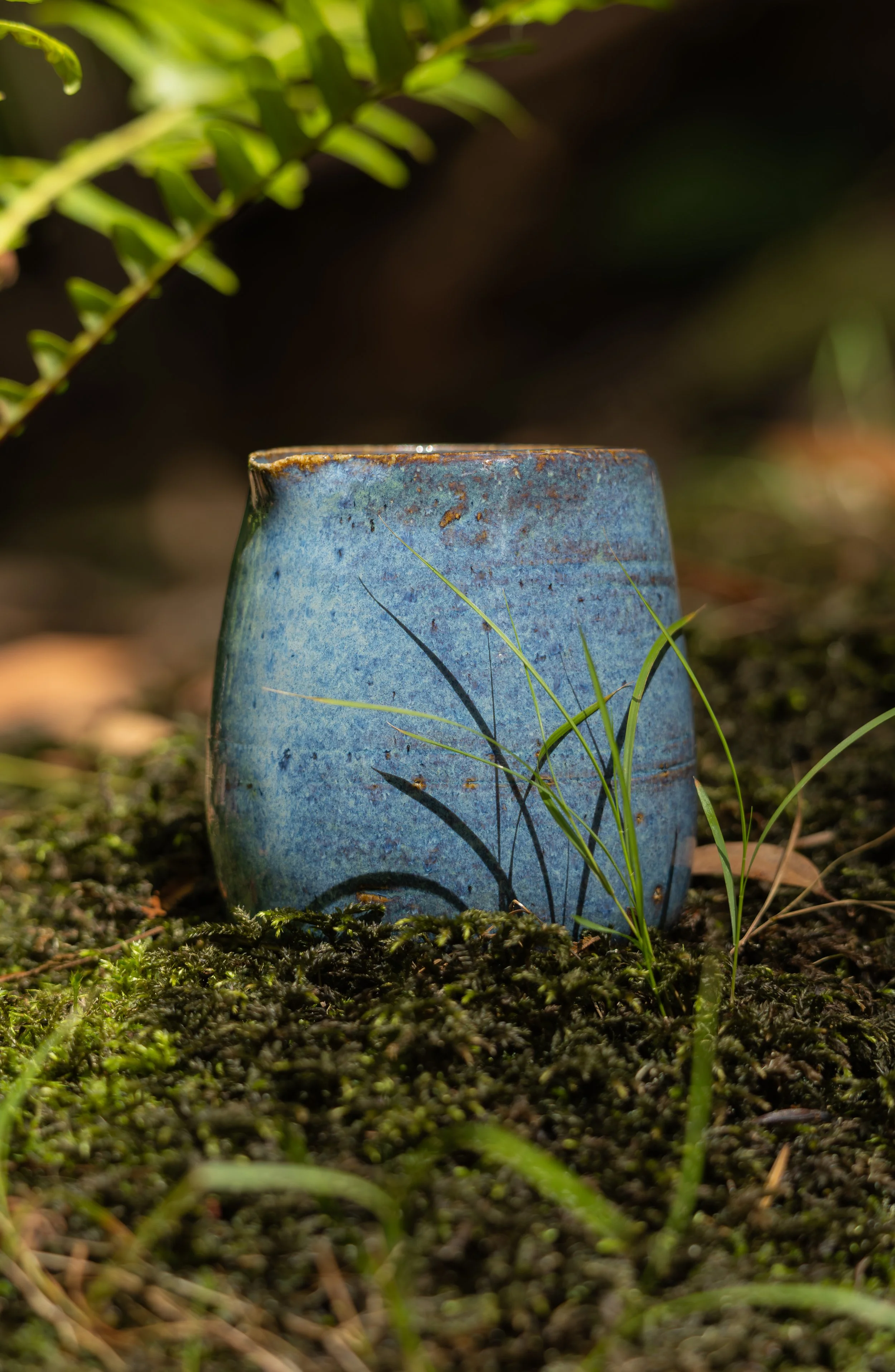 Thrown by hand and glazed in shifting blues, this ceramic jug rests where water slows and listens. A vessel shaped by fire, photographed beside the creek that mirrors its movement.