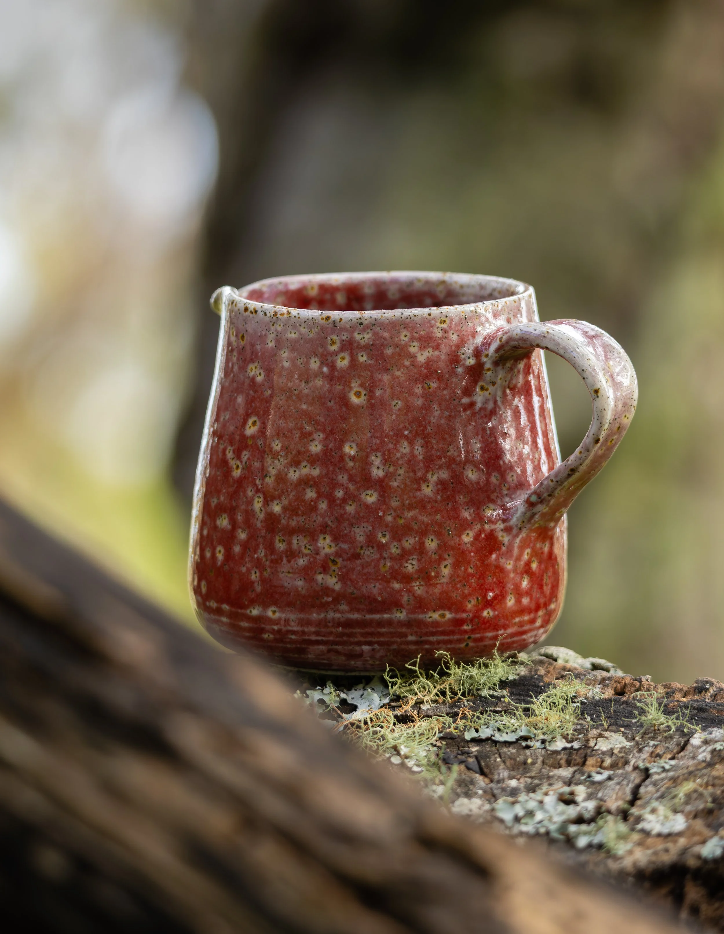 This hand-thrown ceramic jug, glazed in a copper red and soft speckle, is photographed on fallen trees — a functional form shaped by fire, carried briefly back into the bush.