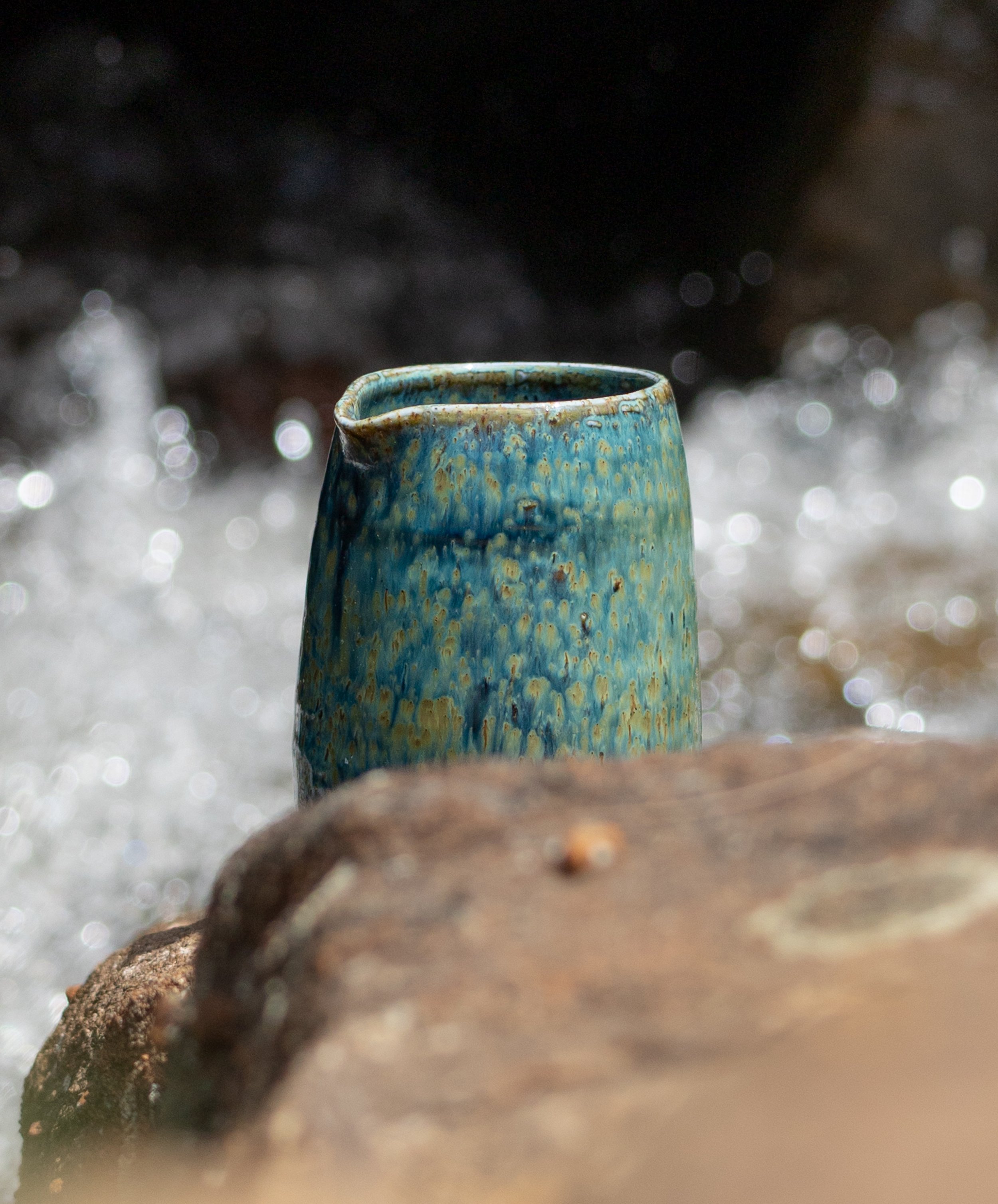 This hand-thrown ceramic jug meets the current head-on — glazed in deep blues and iron flecks, photographed at the waterfall where erosion and endurance share the same edge.