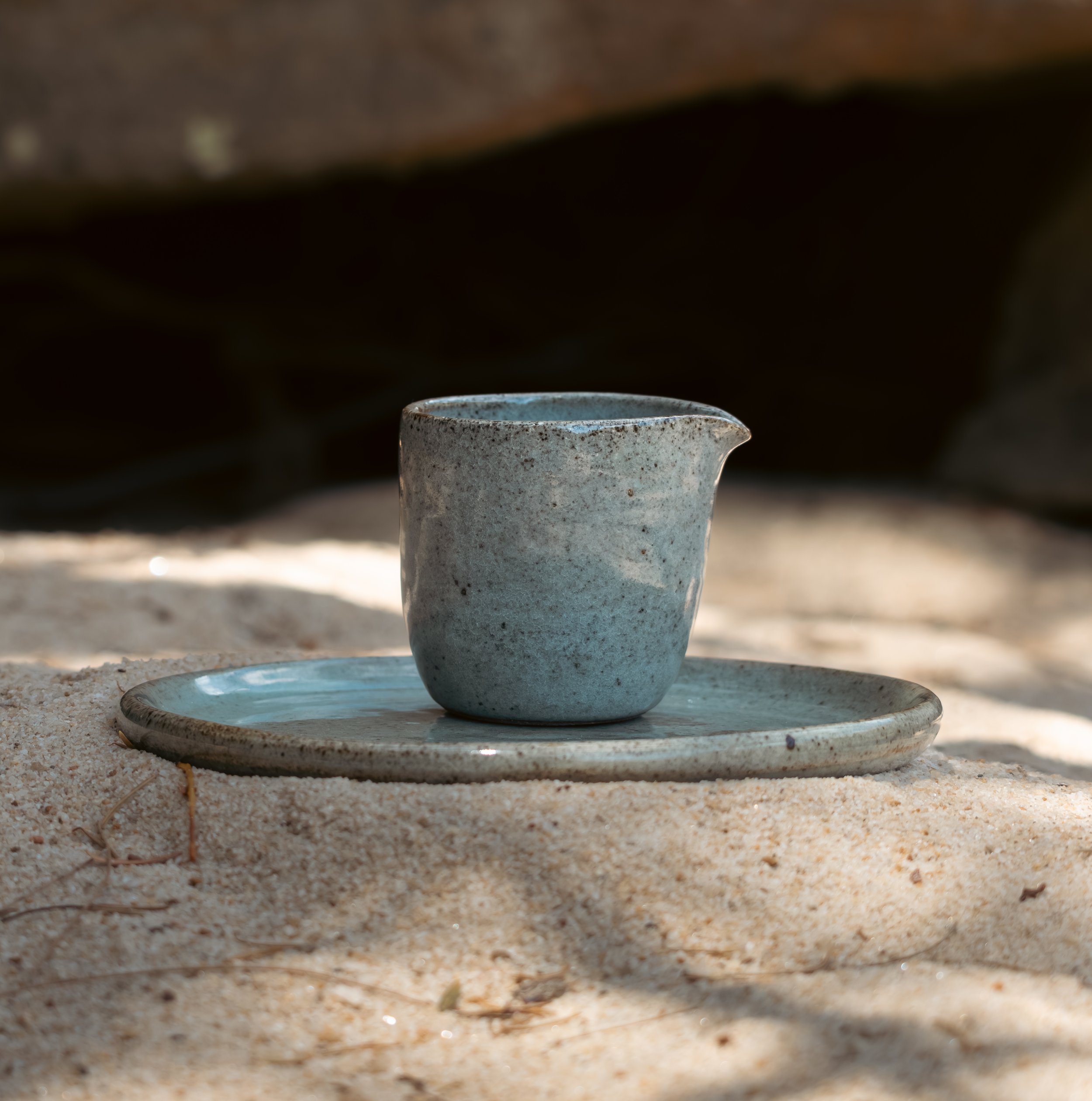 Hand-thrown ceramic jug with matching saucer, conceived as a paired form and resolved through proportion and balance.